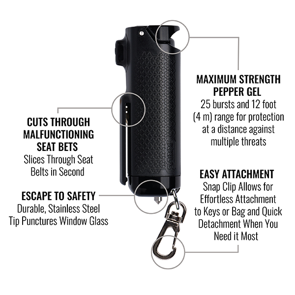 让您的通勤更安全与 SABRE 安全逃生 3 合 1 辣椒凝胶。这种辣椒凝胶提供了工具,可帮助您在紧急情况下下车并保护自己免受攻击。安全带可能是事故发生后要摆脱的障碍。内置安全带切割器有助于切断安全带,并在紧急情况下释放自己。如果车门卡住或电动车窗无法操作,窗户破碎器工具有助于打破窗户。保护自己免受攻击者的攻击;该装置部署了25个强大的辣椒凝胶爆发(是竞争对手的5倍),并具有12英尺(4米)的范围,可在安全距离内提供保护。它包括紫外线标记染料,以帮助当局在喷洒后识别攻击者。翻盖式设计允许在关键秒数时在高压力情况下立即部署辣椒凝胶。凭借行业独有的HPLC实验室,只有SABRE保证在每个罐中都具有最大强度的配方,以帮助您在最需要的时候安心,确定,可靠和安全。SABRE辣椒凝胶是在美国制造的。