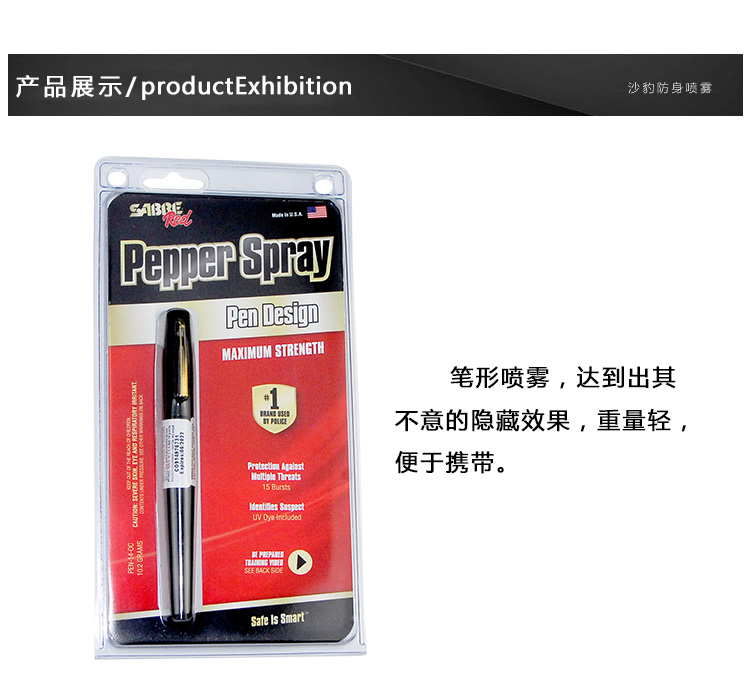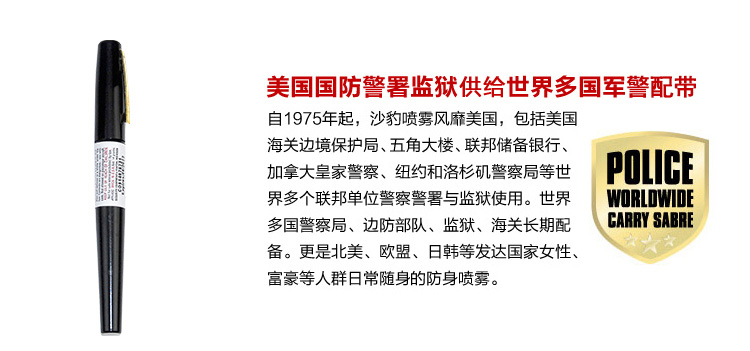 沙豹隐蔽型防卫钢笔型防卫喷雾这是一支笔,更是一款可以防身的喷雾沙豹笔型,最具隐蔽性、安检通过率最好的防身喷雾型号。锥形喷雾喷射效果,在保证更大的覆盖面积的同时具有很好的抗风性能!威力是沙豹喷火型的二倍!适合医护工作者等城市女性、男性携带。作为礼物和自用防身都是非常棒的一款!!!沙豹笔款喷雾最具隐蔽性,锥形喷雾喷射效果,在保证更大的覆盖面积的同时具有很好的抗风性能。作为礼物和自用防身都是非常棒的一款。品牌:SABRE沙豹产品尺寸:14.5cm*1.5cm喷射类型:雾状喷射次数:10次产品重量:10.2克产品产地:美国