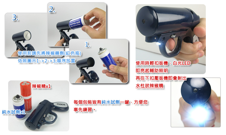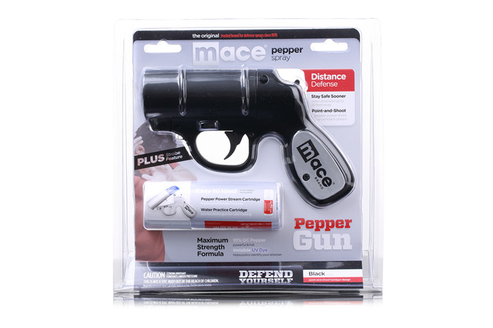 新型Mace辣椒枪是最精准的防卫型喷雾。使用可替换式的水性辣椒精喷剂(红色剂),效力可比拟军用的催泪瓦斯,是最为有效的制敌防暴自卫器。