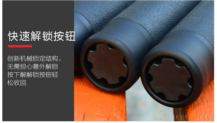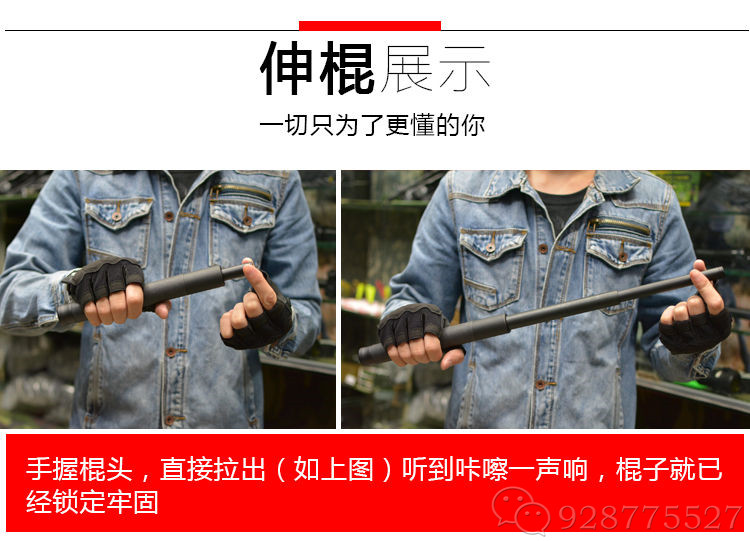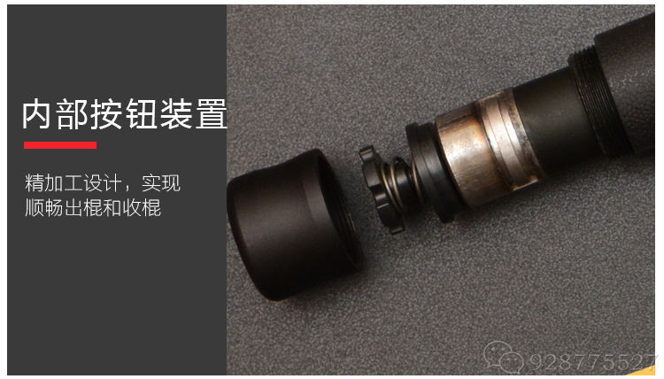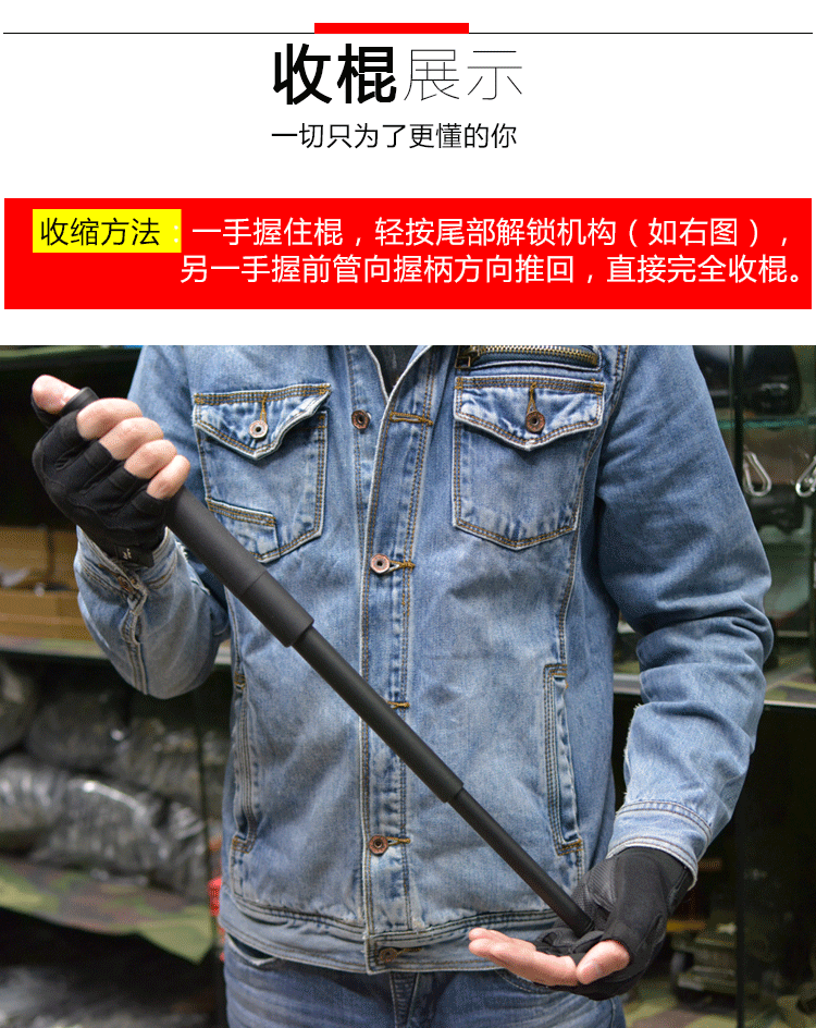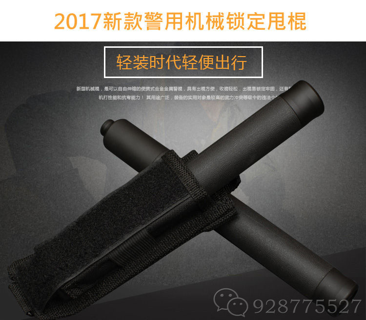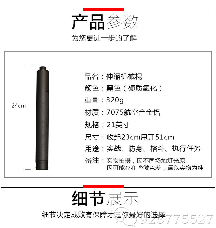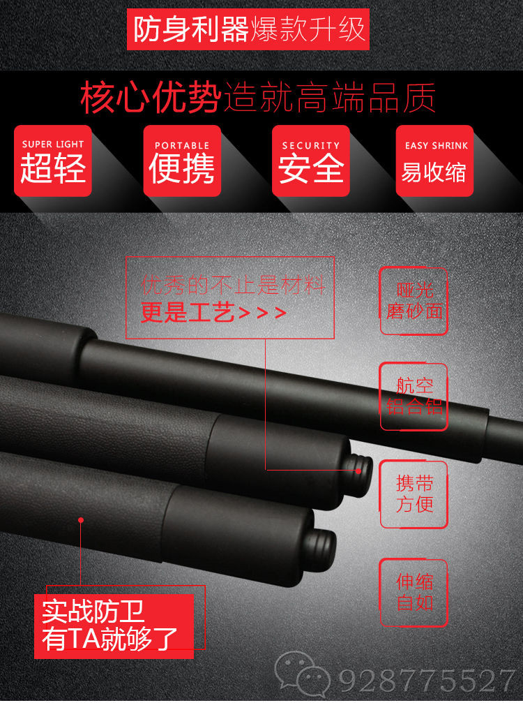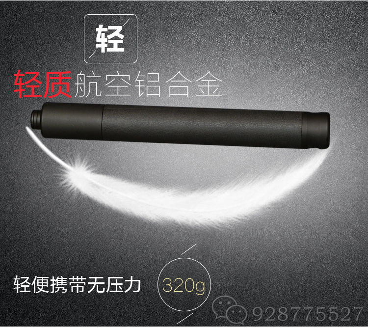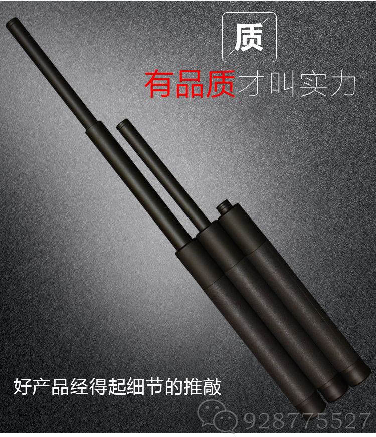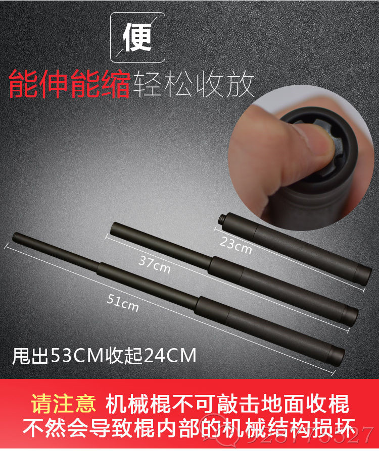 品名:2017款野人谷伸缩机械棍颜色:黑色(硬质氧化)重量:320g材质:7075航空合金铝规格:21寸尺寸:收起23公分 甩开51公分用途:实战、防身、格斗、执行任务备注:实物拍摄,因不同场地灯光原因可能存在些微色差,请以实物为准