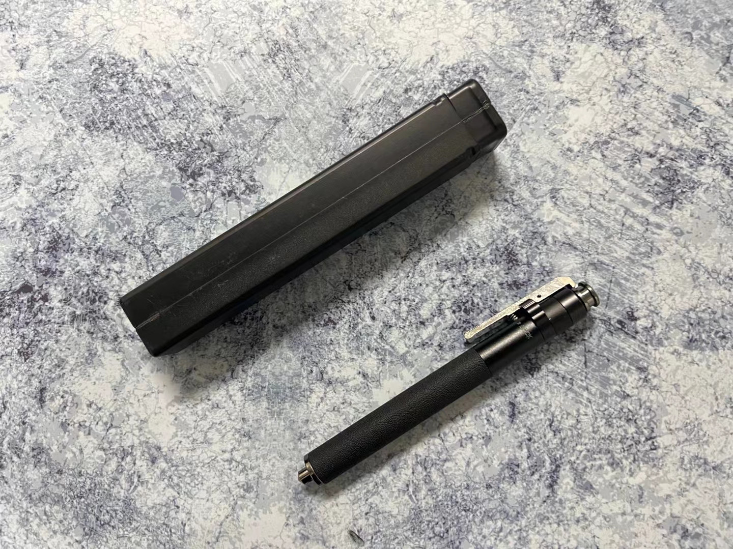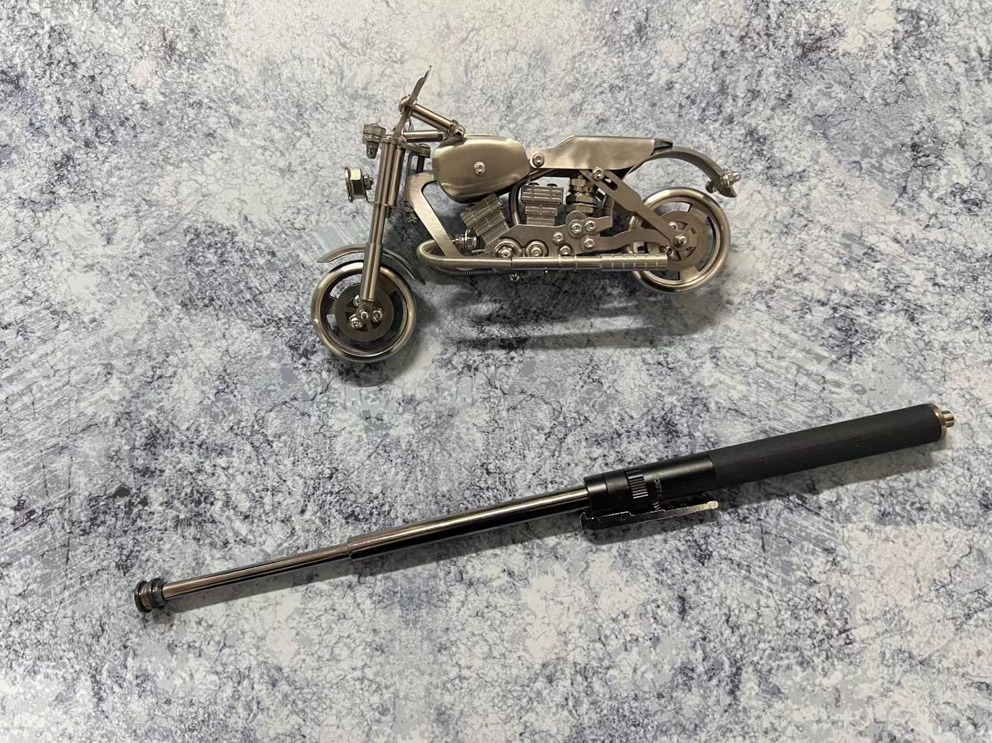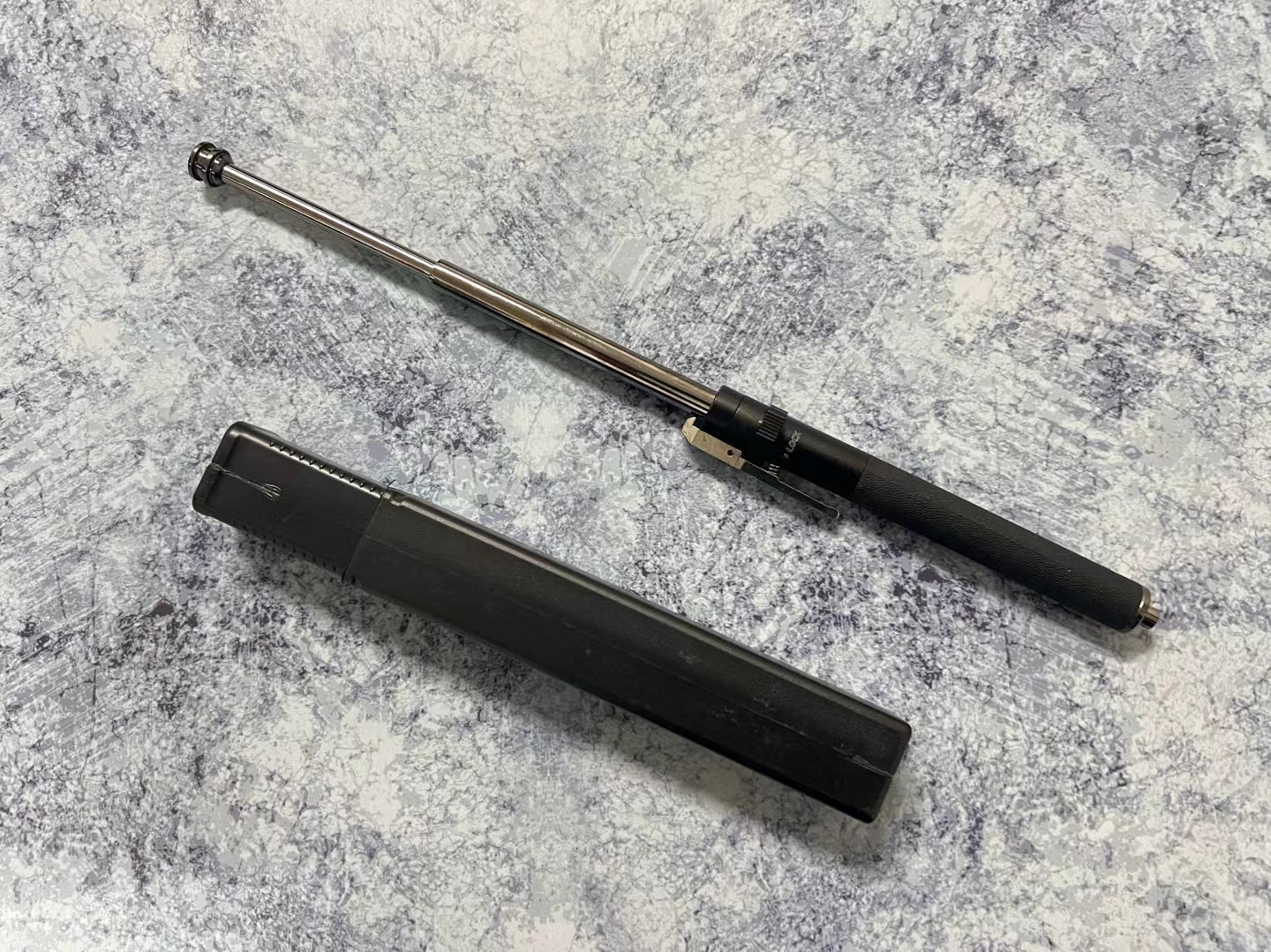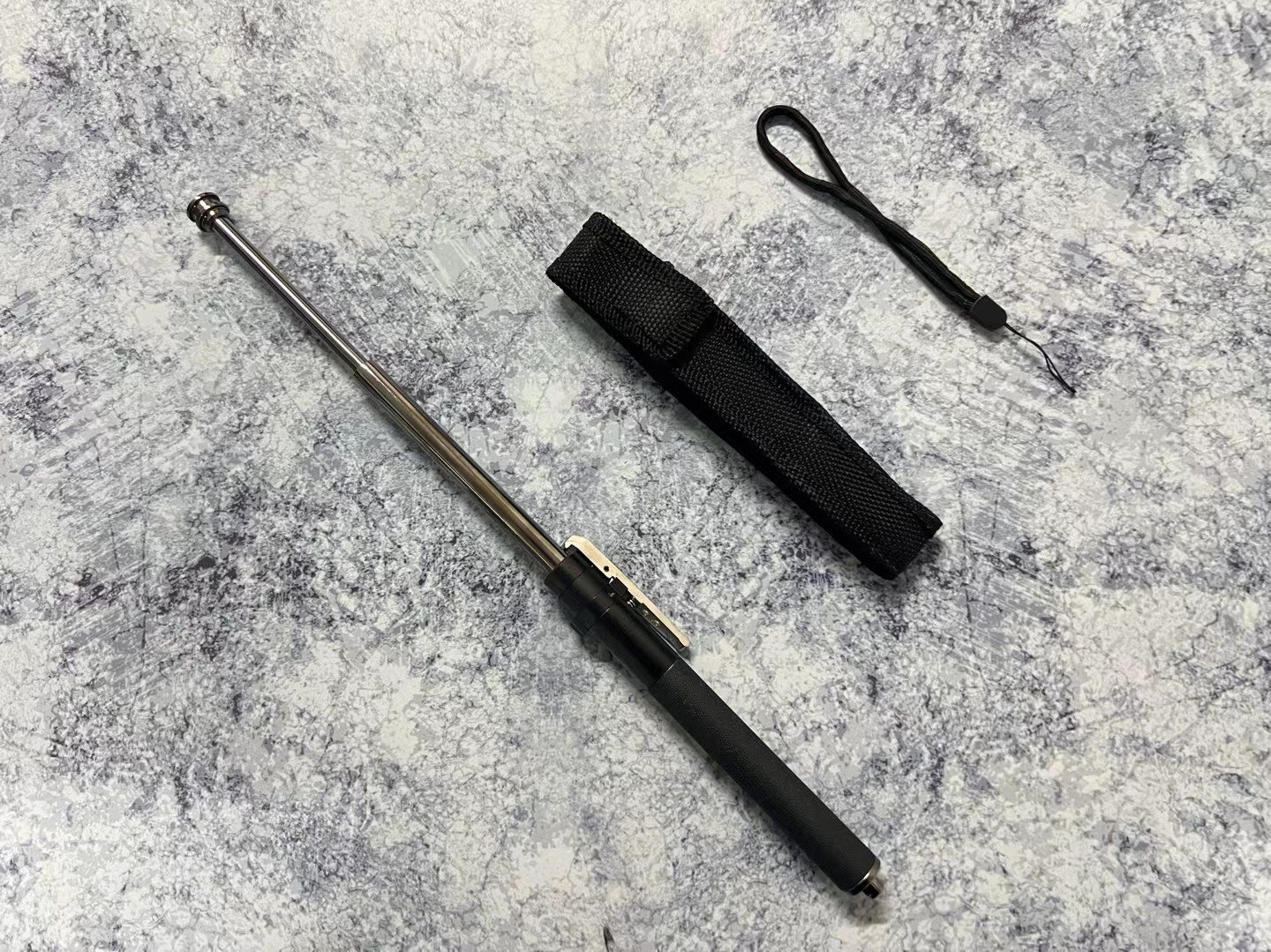 18寸弹簧甩棍,缩短19厘米,伸长38厘米,250克,按下开关,瞬间弹射出棍,自带保险,防止自动弹出,随身携带防身方便