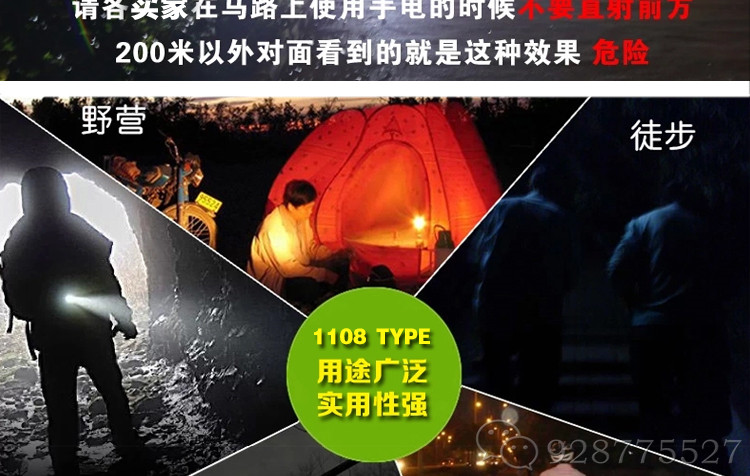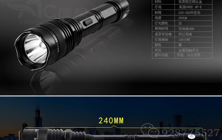 2、采用现役强光照明灯,强光爆闪,三档照明,强光、弱光、闪光,超亮、省电、节能、环保,既亮且照明时间长