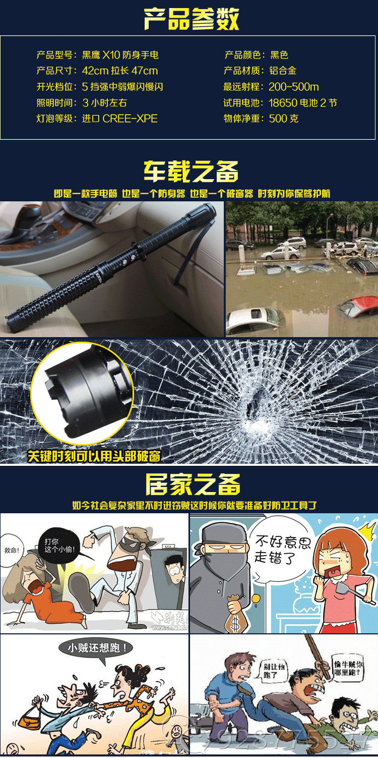 采用全铝合金材质,密度低,硬度高,大大减轻重量,携带舒适,表面狼牙覆盖,抗压耐磨。舒适的手柄,新一代黑鹰X10防身电棍,手柄处添加的高质量橡胶套,挥动时 手掌不会生涩或者摩擦导致手起泡,并且有很强的防滑效果。X10采用金属开关键帽经久耐用,轻轻一按即可触发启动,按键手感弹力足。尾部总开关,中部模式调节,双重保险,为您的安全保驾护航。