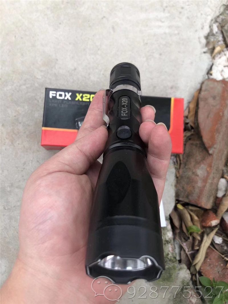 全金属款X20电棍,是FOX系列2018年的新款,此款防身手电采用高强度航空铝合金材质,抗压防震效果极好。防滑手柄设计,带挂扣,外形炫酷,独家开模,采用最先进的前植轻触开关,软橡胶按钮,使用得心应手。8500万伏特 超强功率,三档强光照明:强光-弱光-爆闪