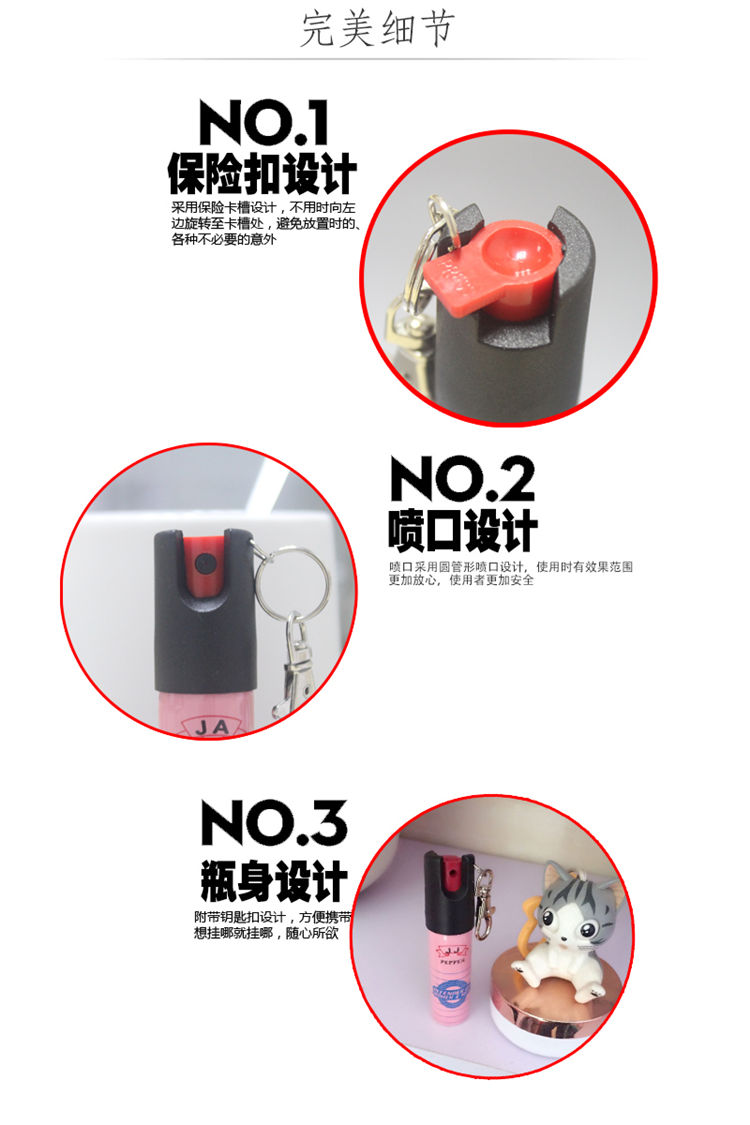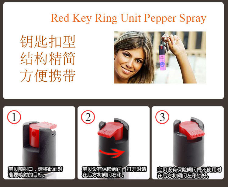 20毫升钥匙扣防狼喷雾 结构精简,方便携带,可以和钥匙放一起,防狼喷雾设有保险开关,有效的避免不小心按到的情况。旅途上带着“它”你会觉得很心安,可以送女友、送孩子、送家人,礼轻情意重,这不只是一件物品,而是呵护与关爱。