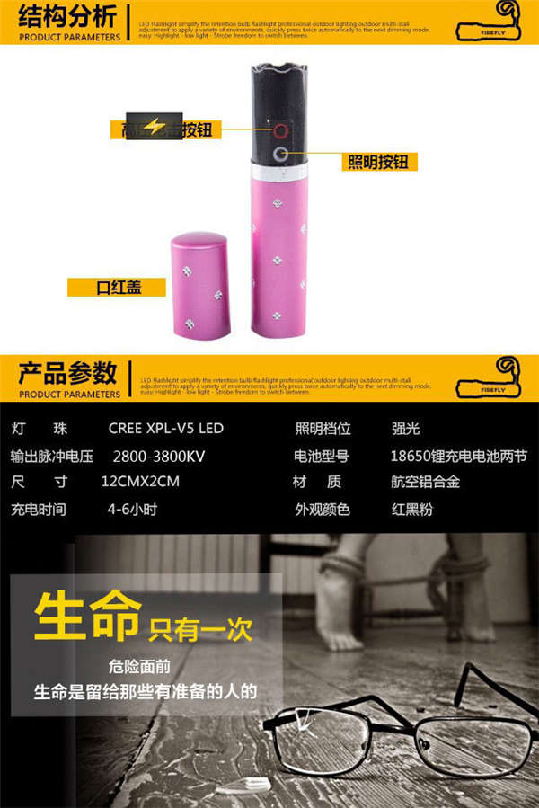 迷你口红电棍,小小身躯却能释放出3800万伏的高压,口红般大小,可以随身携带,不易被察觉。抽出盖子,按红色电击键就能释放出高压电击(因为有盖子,所以口红款不设计保险开关),使用非常简单,小白也能很快上手。电棍带有强光LED照明功能,当目标向你走来时,可以开启LED强光灯,使目标睁不开眼睛,阻止目标前进。适用于各类人群。
